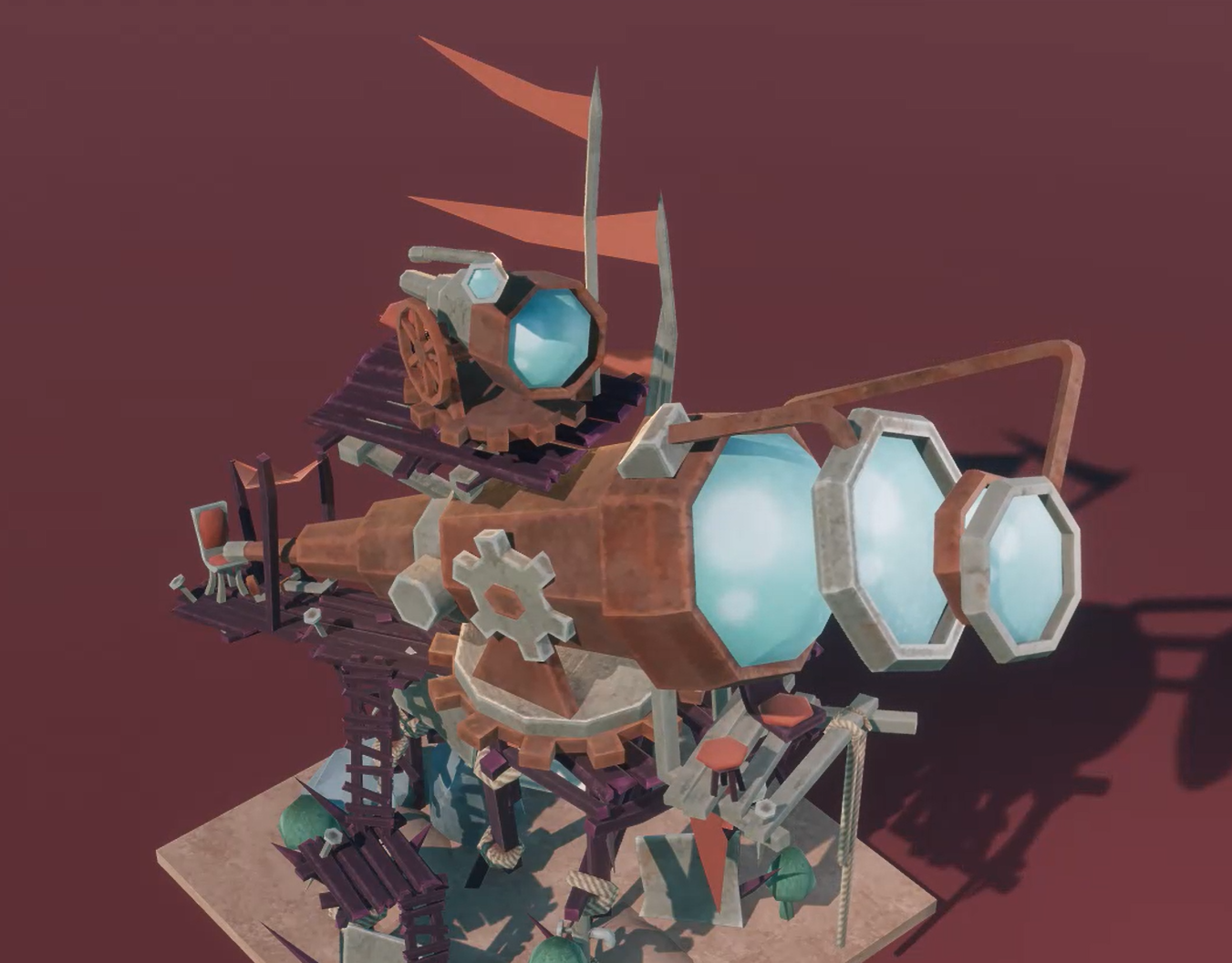 For the texturing, only base colour and roughness were used. This challenged me to create readable materials without the help of (for example) metalness- and height maps.